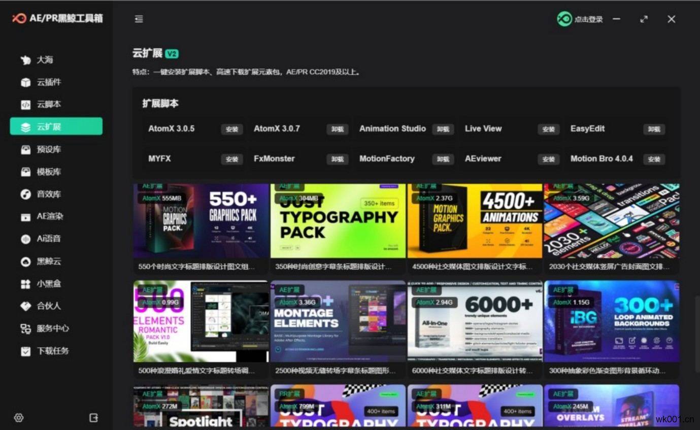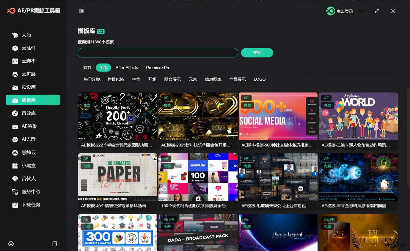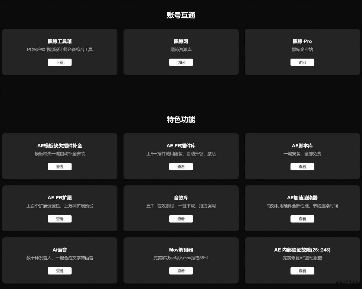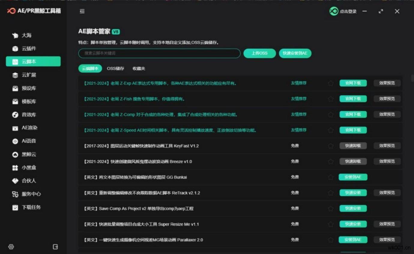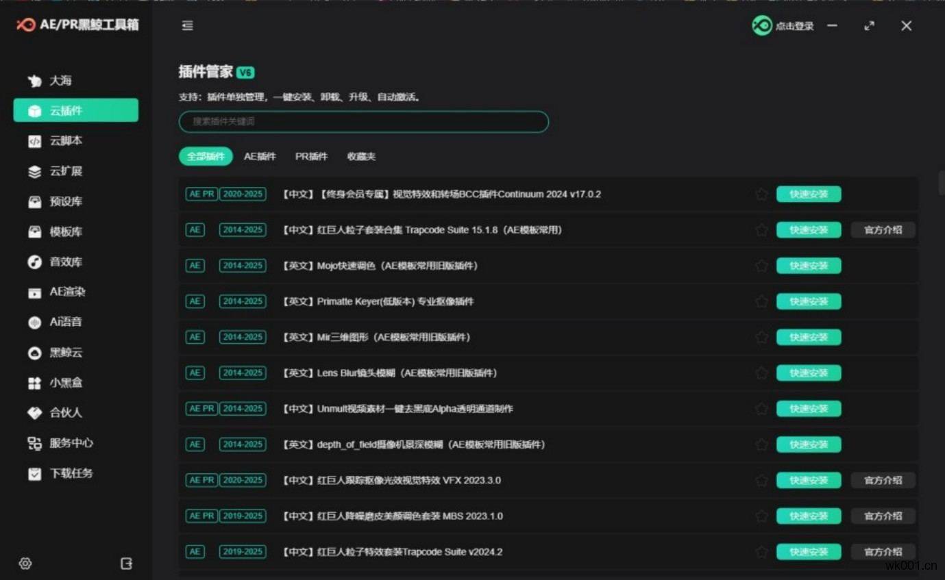 黑鲸工具箱是一款windows客户端的集AE资源整合和便捷安装/卸载各种脚本、插件、扩展功能以及修复各种错误的效率实用工具,是后期工作者使用AE的得力助手,可月付,也可一次付费终身享用,且无绑定设备限制,支持Win10/11,AE\PR 2014 - 2025版本。